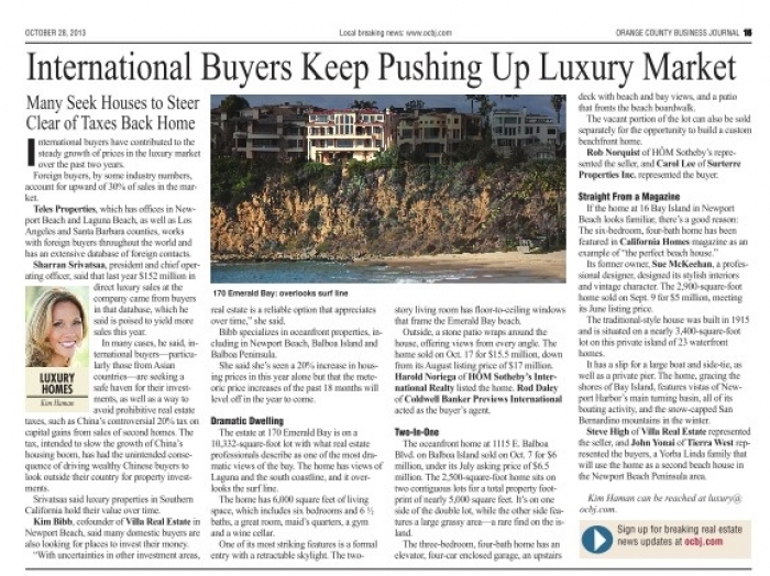 Villa Real Estate continues to make headlines for successful transactions and industry expertise. Kim Haman, Luxury Homes Columnist for the Orange County Business Journal, interviewed Villa Real Estate Co-Founder Kim Bibb and quoted her in the lead of this week’s report.