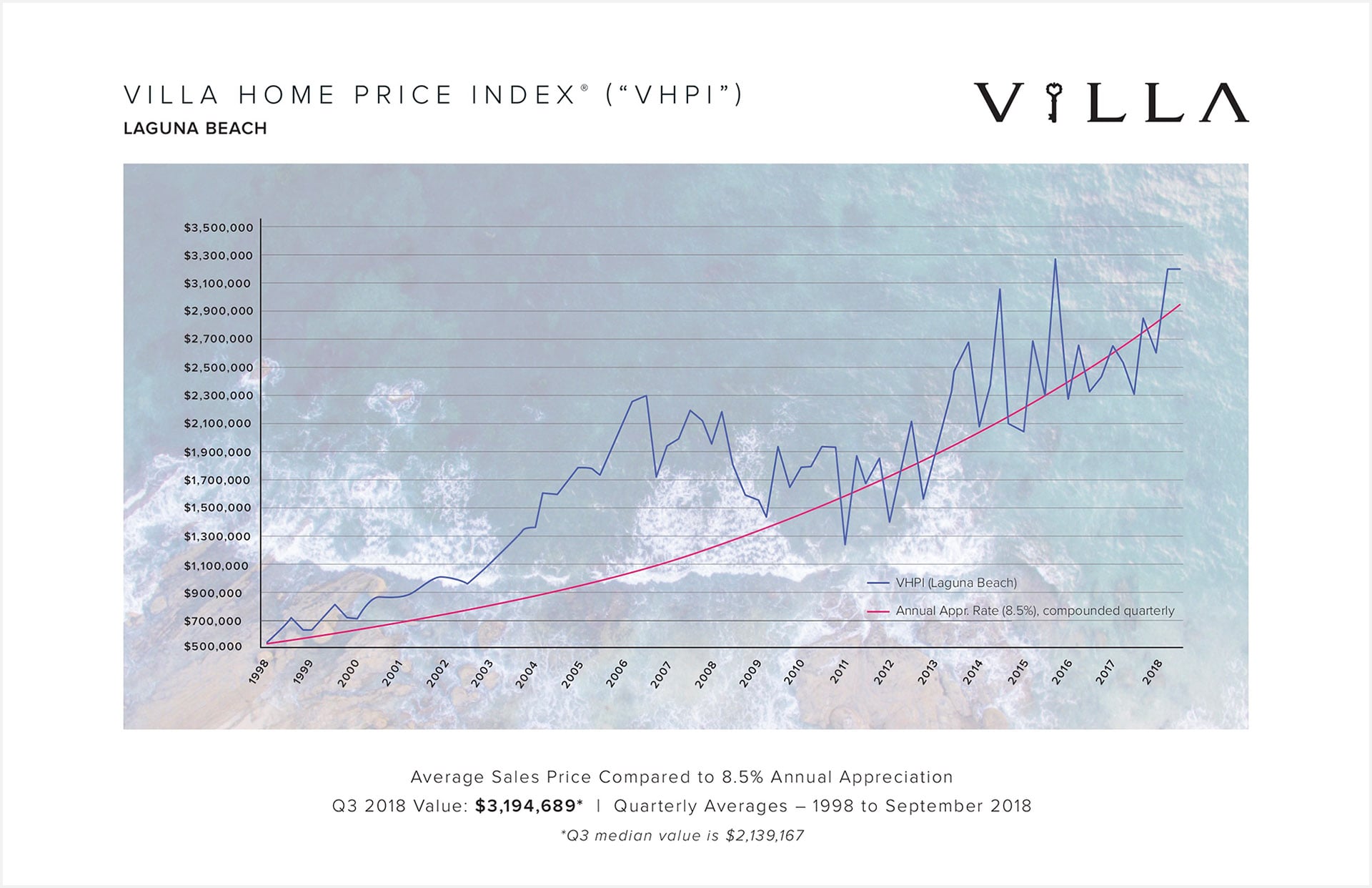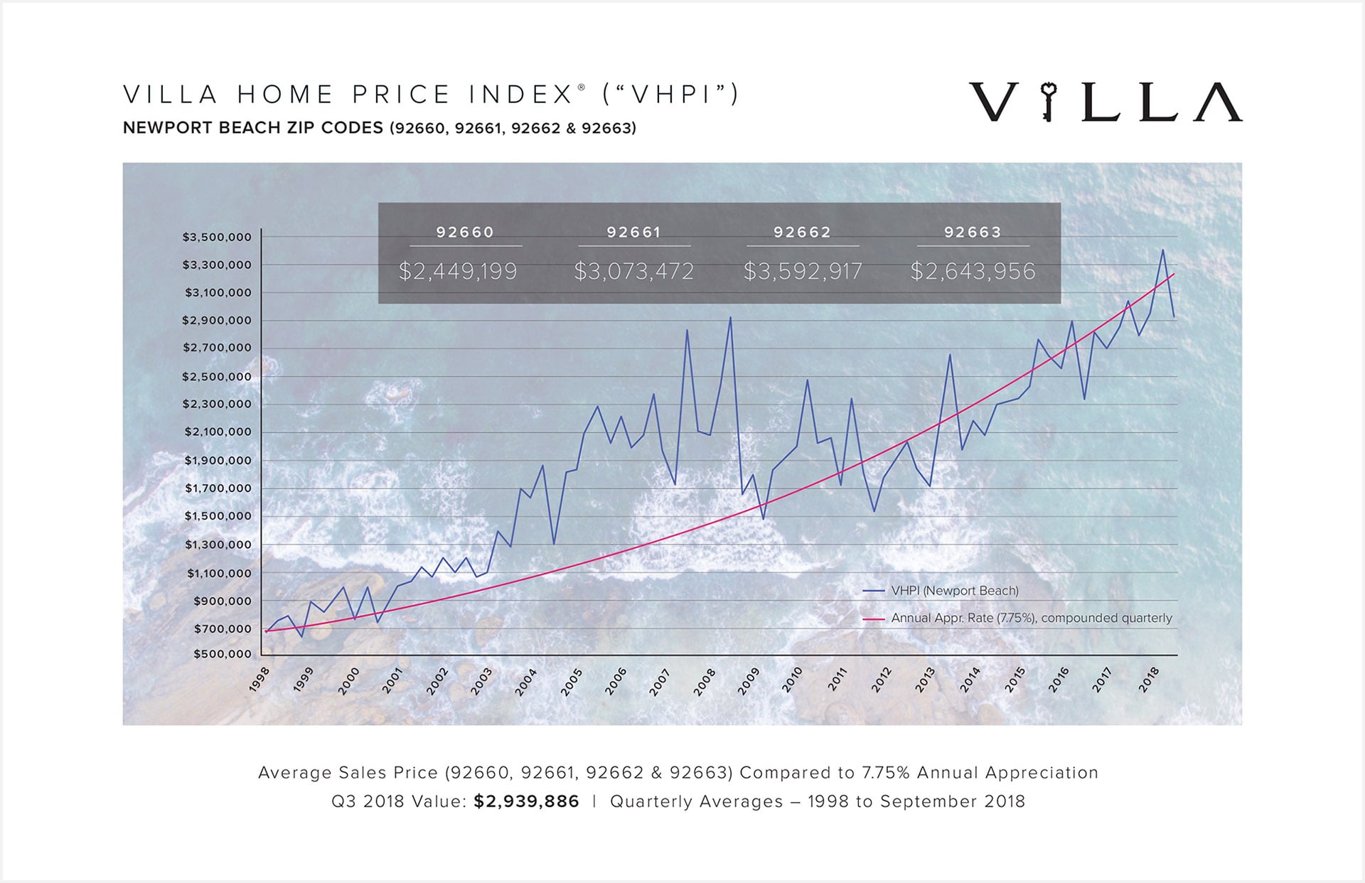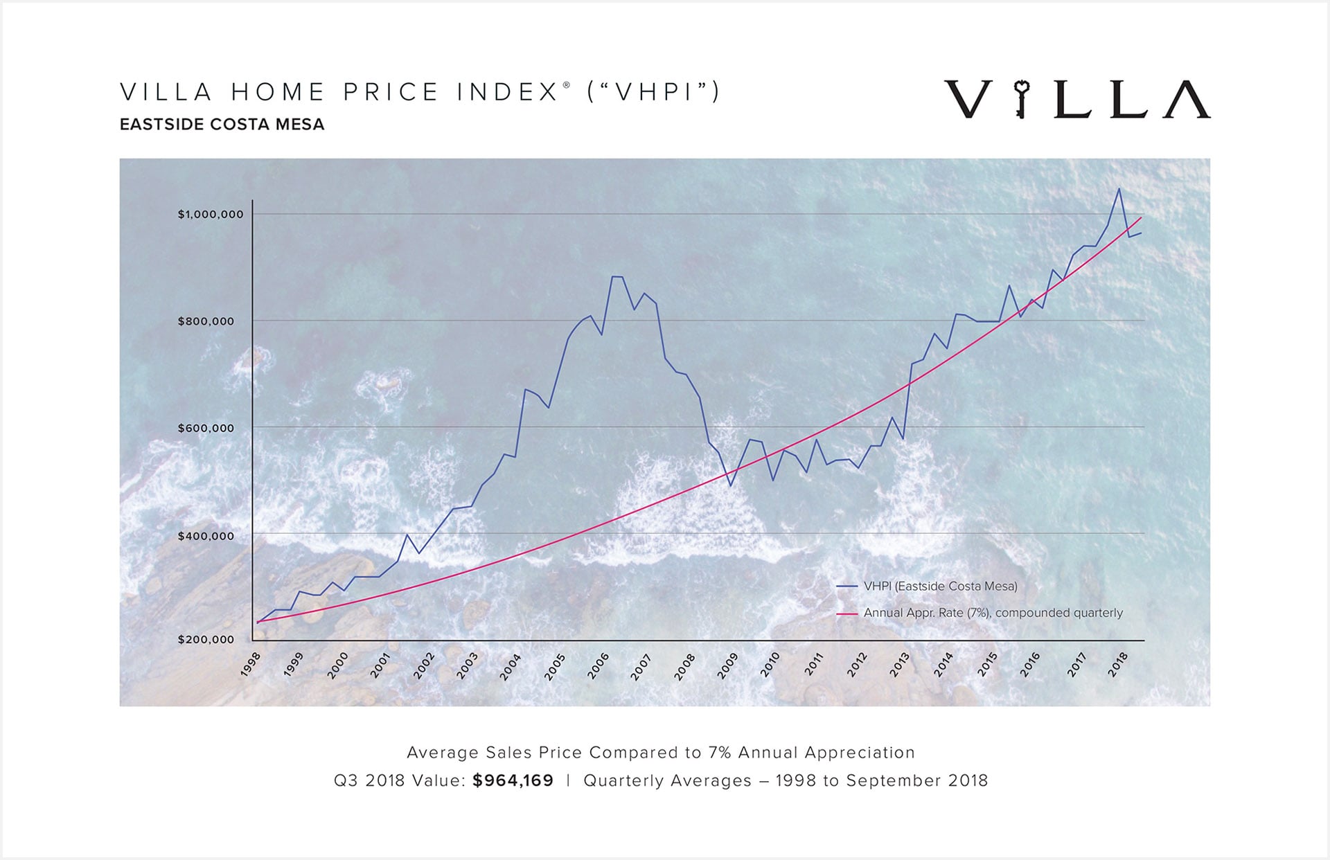 The VHPI tracks single family detached housing prices since 1998 in select neighborhoods where Villa Real Estate is actively representing buyers and sellers of residential real estate properties. The index provides a look at real estate values on a micro level, focusing on Newport Beach, Newport Coast, Corona Del Mar, Laguna Beach and Eastside Costa Mesa.