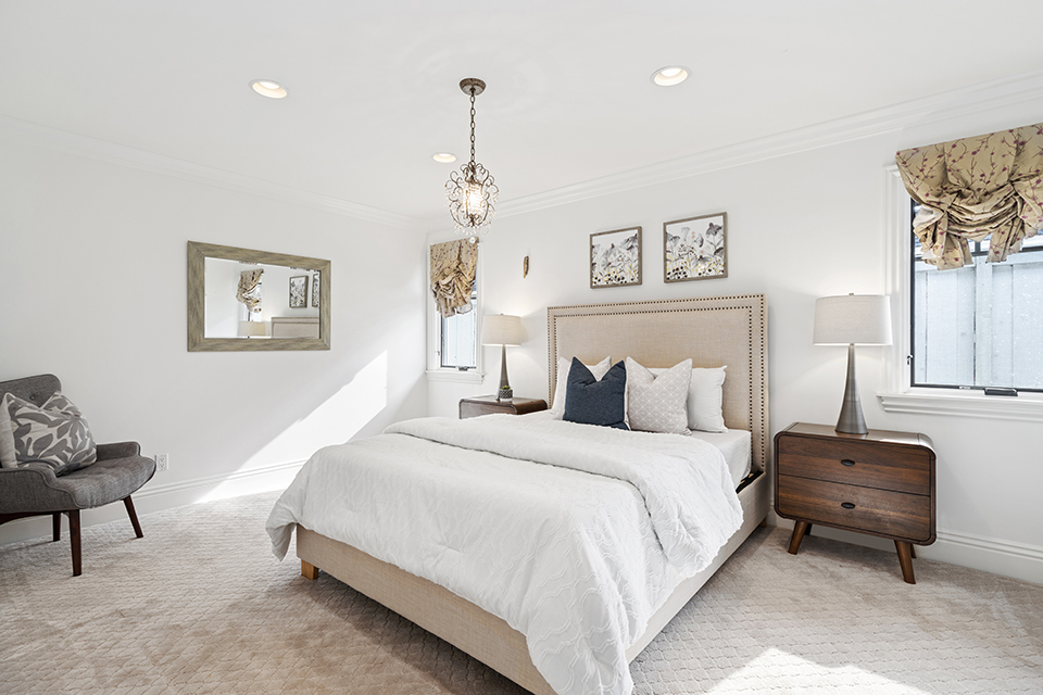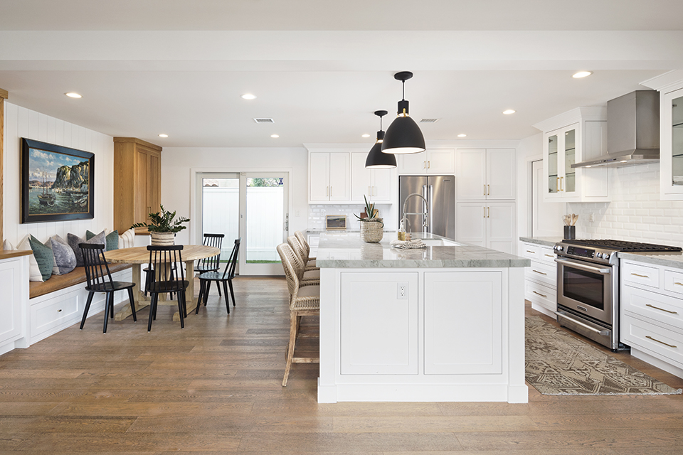 This newly remodeled Cameo Highlands residence is sure to be a buyer favorite for its stylish modern farmhouse aesthetic and single-level floorplan, all at a compelling price point. Olive trees and native California landscaping grace the white-wash brick exterior and paved walkway leading to a Dutch entry door. The home’s transitional interior, hallmarked by clean lines and modern accents, features four bedrooms, two-and-a-half bathrooms, a white-and-bright kitchen, dining area and family room, all assembled around a central courtyard in a U-shaped floorplan. The professionally designed interiors are fitted with white shaker cabinetry, marble countertops, French oak floors and modern lighting throughout.