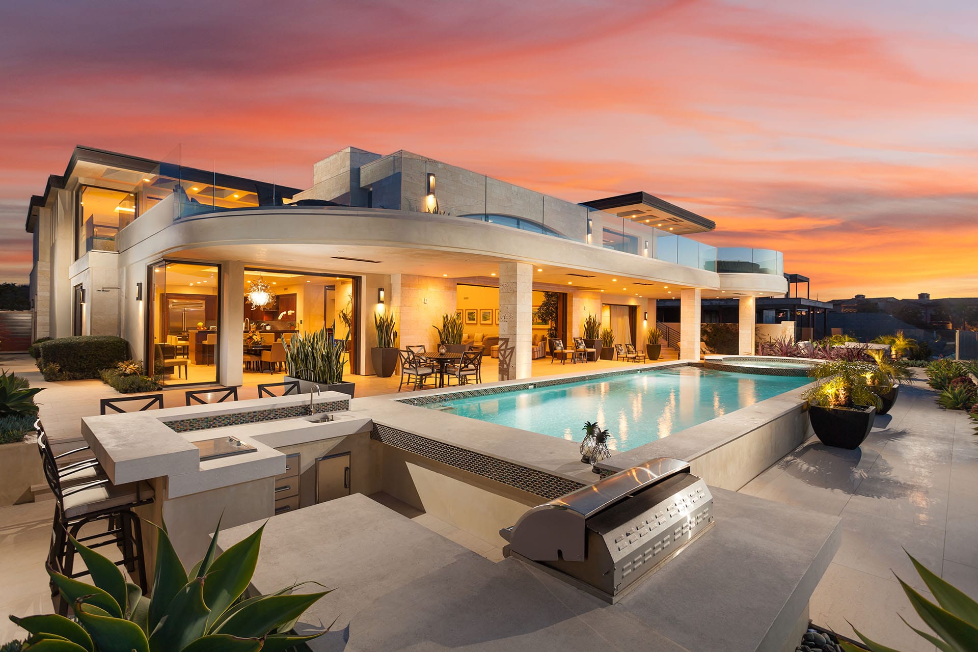 Within the guarded gates of Dana Point’s The Strand at Headlands, stands this custom contemporary ocean view estate designed by renowned architect C. J. Light. As if taken from the pages of Architectural Digest, this remarkable residence takes inspiration from the finest global influences, culminating in a work of modern art. The precisely located homesite offers breathtaking panoramic views stretching as far south as San Diego, encompassing Catalina Island, serene city lights, the coastline, and the Pacific Ocean. A dramatic entry sets the tone for the home’s impressive 7,500+ sq. ft. regal design with soaring ceilings, elegant details, and exceptional living spaces. Centered around the vast great room, complete with luxe wet bar, the main level features a lavish master suite, 2 ensuite bedrooms, a dining room, and a stunning kitchen with top-end appliances and an oversized pantry. A grand staircase leads to the upper level, featuring an open entertainment lounge with mahogany bar, a secondary master suite with views of Dana Point Harbor, and a separate suite with kitchen and living room. With 2 front decks, a raised terrace, large upper deck, covered lower patio, limestone decking, a raised pool and spa with swim up bar, and fire pit, the outdoor space takes full advantage of the coveted California climate. A 3-car and separate 1-car garage, mahogany wine wall, Wyland sliding door systems, and custom mahogany doors and floors round out the amenities of this exquisite estate.